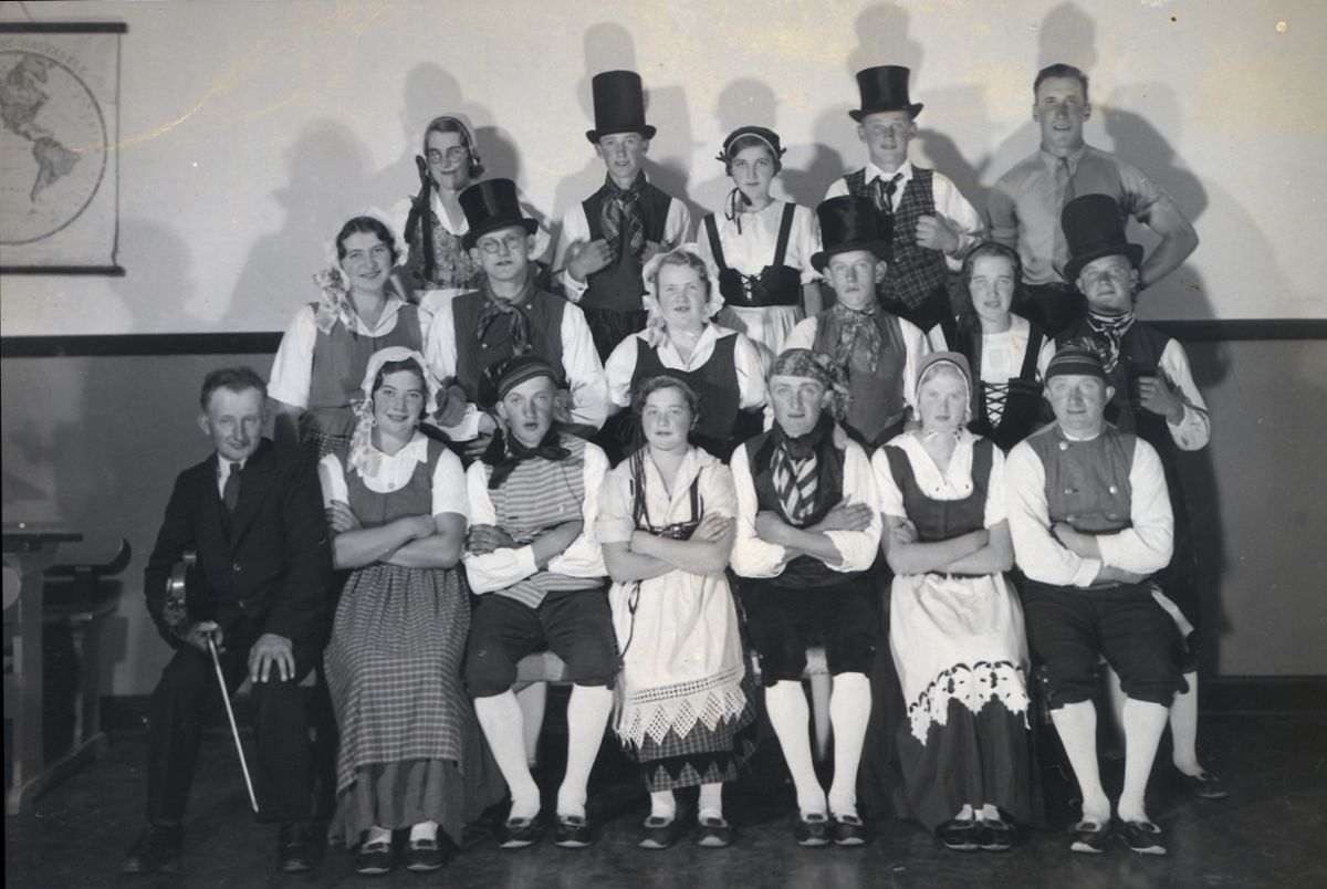 Bag på billedet står der ”Høstfest 1936”. Det ser mere ud som folkedansere, men måske har folkedanserne underholdt til en høstfest.
