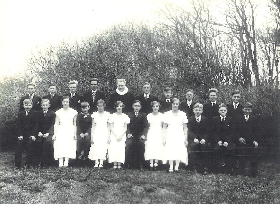 Bagerst f.v.: 2. Hans Adolf Hedelund Hansen, 4. Minna Nielsen, Holme, 5. Ellen Vestergaard Jensen, 6. Pastor Madsbøl Nielsen, 7. Magda Imer, Klim Rimme, 8. Grethe Justesen, Holme, 9. Regnhard Nielsen, 10. Christian Kristensen.