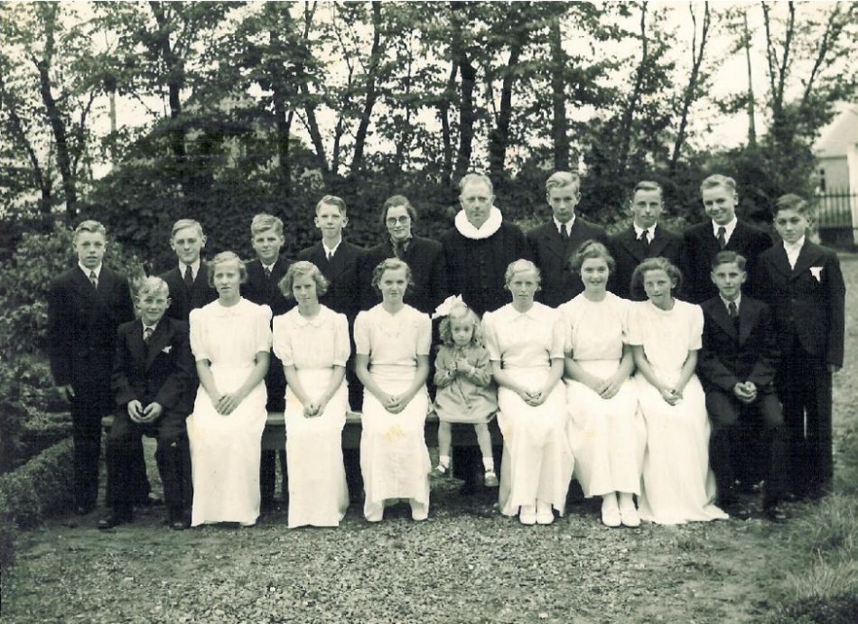 Bagerst f.v.: 1. ??, Klim Engvej, 3. Kesse Andersen (Thorup Nørgaard), 4. Arne Knudsen, Klim, 5. Fru Anna Nielsen, 6. Pastor Madsbøl Nielsen, 7. Hans Madsbøl Nielsen, 8. Ove Nielsen, Fjordholmen, 9. Erik Djernæs, 10. Henning Hansen.