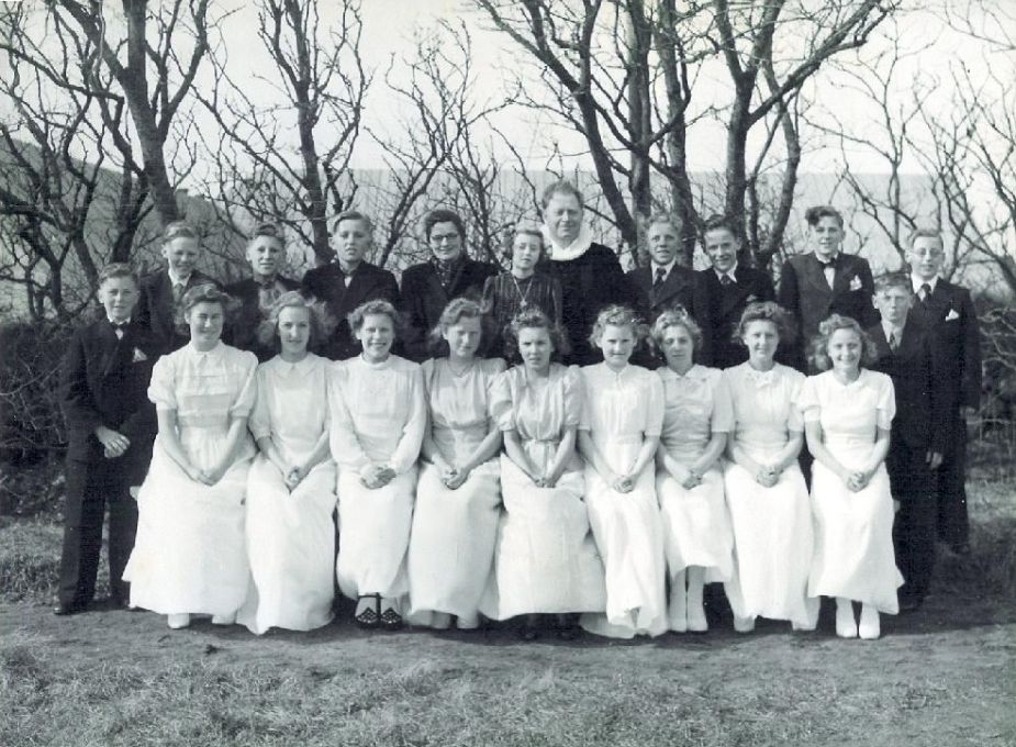 Bagerst f.v. stående: 1. Egon Bjerggaard Laustsen, 2. Leo Kjær, 3. Knud Svendsen, 4. Jørgen ? Nielsen, 5. Anna Nielsen, 6. Jonna Madsbøl Nielsen, 7. Pastor Madsbøl Nielsen, 8. Niels Møller, 9. Winther Sønderhaven, 10. Svend Aage Nielsen, 11.. Gunnar Olsen, 12. Henning Nielsen.