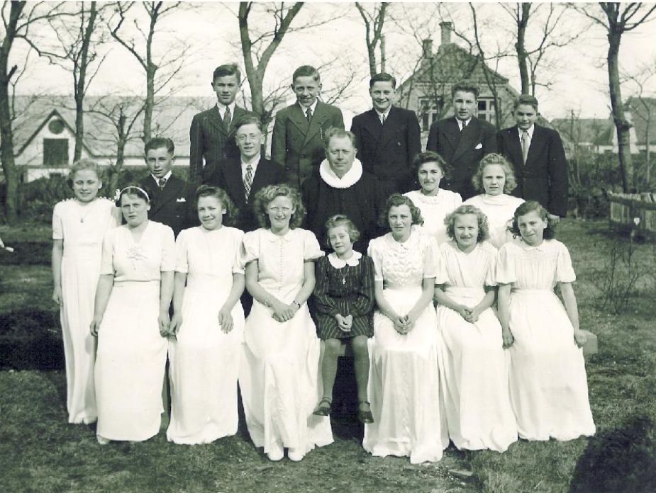Bagerst f.v.: 1. Laura Christensen, 2. Hanne Svendsen (?), 3. Pastor Madsbøl Nielsen, 4. Sigrid Brun (født Nørgaard, Ullerup), 5. Irene Mikkelsen.