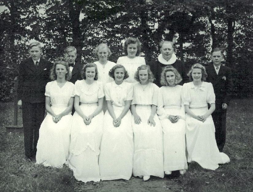 Bagerst f.v.: 1. Børge Kristensen (Post), 2. Kresten Sørensen, Holme, 3. Edith Bang Toft, 4. Lis Djærnis, 5. Pastor Madsbøl Nielsen, 6. Elmer Holm, Klim Mark.