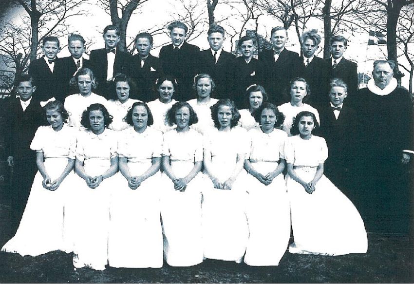Bagerst f.v.: 1. Johannes Klitgaard, 2. Gunnar Olsen, 3. Erik Andersen, 4. Knud Nielsen, 5. Jens Thomsen Madsen, 6. Søren Kirk, 7. Richard Sørensen, 8. Jørgen Pedersen, 9. Knud Pedersen, 10. Kaj Pedersen.