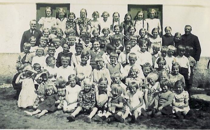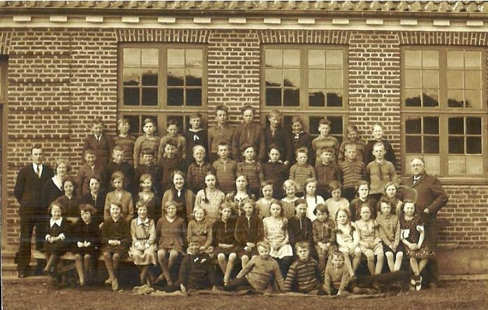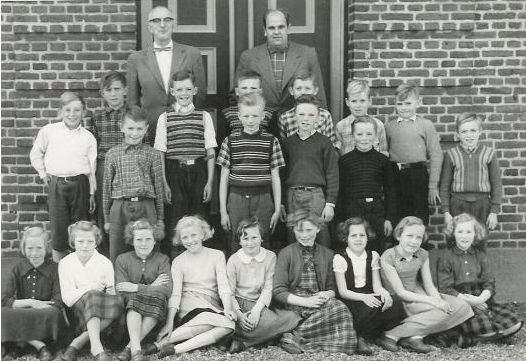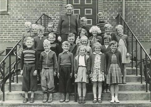 Bagerst: Lærerne L.C. Mortensen og Kaj Rubak. Elever bagerst f.v.: Chr. Martin Nielsen, Jens Strandvig Christensen, Hans Pedersen, Orla Andersen, Erik Larsen, Ove Andersen, Niels Chr. Lambert Pedersen, Niels Peter Pedersen. Drenge i midten f.v: Jens Martin Gundersen, Poul Hegelund, Niels Jørgen Grishauge, Frank ?. Piger forrest f.v.: